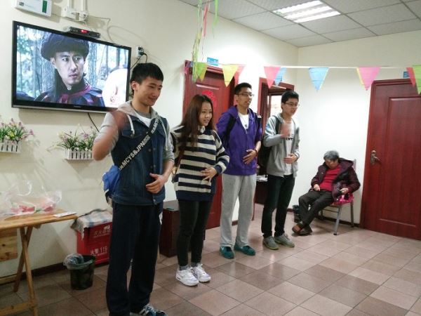 服务站的站长接待了志愿者们,并向老人们介绍了志愿者们。志愿者们开始和老人们交谈起来,为他们削苹果,讲故事。有的志愿者为老人们唱红歌,成功地活跃了气氛。有的志愿者还和老人们一起拍照,老人们的脸上露出了幸福的笑容。老人们谈得很尽兴,和志愿者们讲起来自己年轻时候的故事。有的老人还为志愿者唱歌。在护工的带领下,志愿者为老人们整理床铺,打扫卫生。11时30分,老人们吃午饭的时间到了。站长和护工们将饭菜分好,志愿者们帮着把饭菜端到老人们面前,开始喂老人们吃饭。最后,志愿者们以一个手语操表演,道别了服务中心的老人们。