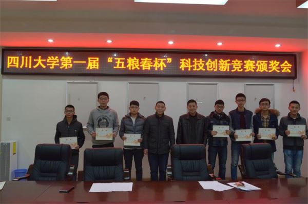 高度重视创新人才的培养,“五粮春杯”全国大学生移动互联创新设计大赛为广大同学提供了一个学习电子技术、培养创新思维、锻炼实践能力的平台。这与国家提出的“大众创业、万众创新”的理念相吻合。他鼓励同学们开拓思维,勇于创新,通过参加比赛来不断提升自我。随后学院领导为获奖同学颁发了获奖证书并合影留念。本次大赛共评选出作品类一等奖3组、二等奖3组、以及优胜奖2组,创意类二等奖1组。颁奖典礼在热烈的掌声中结束。