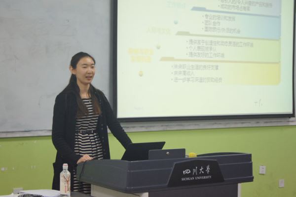 下午四点,教室里座无虚席,讲座正式开始。首先,主持人介绍了李琳女士和本次讲座的主题。接着,李琳女士通过播放视频的方式具体分析,充分调动了同学们的积极性。同时,她还向同学们讲述了不同类型的人格,引导同学们对自己进行正确的自我认知,从而让同学们挖掘出自己的职业兴趣。并且,她以唐僧、孙悟空、猪八戒、沙和尚这个四人团队为例,生动形象地向同学们讲述了团队的基本构造。然后,她向同学们介绍了霍兰德职业倾向测试,并且推荐了《这些道理没人告诉你》这一本面试必备书籍。最后进入到自由提问阶段,同学们踊跃提问,李琳女士详细地解答了同学们的困惑。