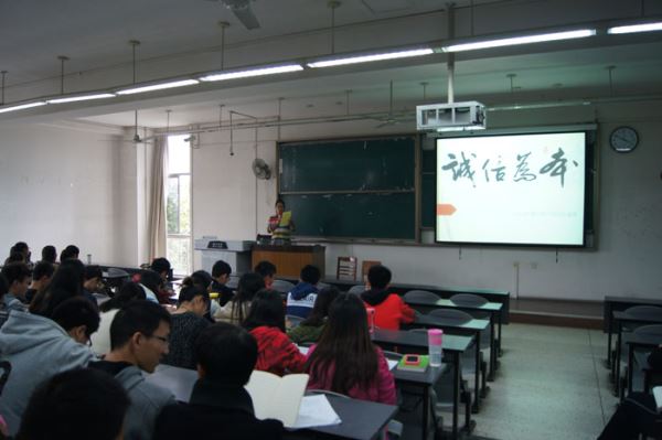 首先,辅导员老师们以若干往年的考试作弊案例作为开场,引出本次形教课的主题:诚信为本,以诚信意识践行社会主义核心价值观。老师们通过概念、实时热点等多个方面解释了在日常生活中讲诚信的重要性,同时也提到了最近在互联网上比较火的"编造发布虚假信息",不法分子通过微信朋友圈等渠道传播虚假信息,转发量超过500条就会被处以拘留、罚款等处罚,更从侧面体现了不讲诚信的危害性。最终辅导员老师们会按照学校的安排向大家介绍了有关诚信的微小说、微视频等比赛,呼吁大家踊跃报名参加。