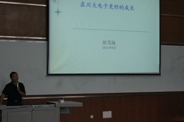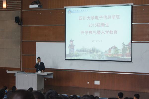 学院的专业,培养目标和就业方向,使同学们对自己的专业有了更深一步的了解,最后周院长介绍了本科生培养模式与方法以及创新人才培养工程等,并详细说明了我们学院要学习的各类课程及需修满的学分。通过周院长详尽的介绍,同学们对学院的科研条件学校资源等也有了更多地了解。接着,陈笃海副书记上台就“在川大电子更好的成长”这一话题发表了讲话,让大家对崭新的大学生活充满了无限的期待。最后陈林老师讲解了接下来几天的学生工作并组织新生离场。