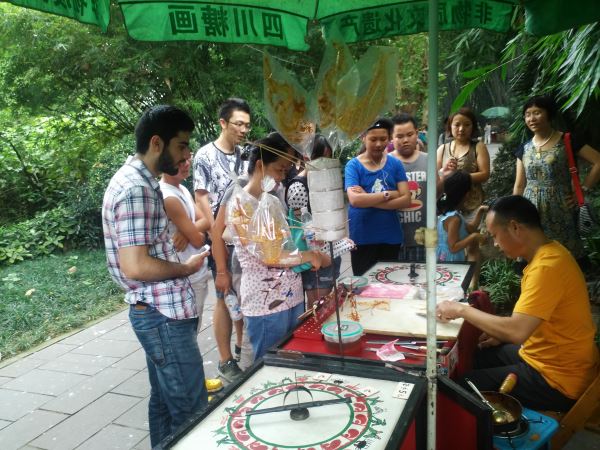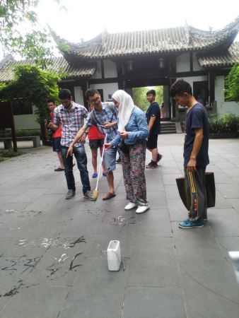 活动开始,外国友人和望江公园的老爷爷们学习了蘸水在地上书法,Ghali和Hassnaa亲切的写了“你好”二字,对中国的书法文化有了更多的了解。接着,我们一行去参观了四川糖画,大家都对糖画师傅高超的技艺感到敬佩,画出的龙的图腾,栩栩如生。最后,为了让留学生们更好的了解巴蜀文化,大家去公园里的茶馆喝茶,并教授留学生们打四川麻将。其实,巴蜀文化不仅仅局限于大熊猫基地,金沙遗址等,更加贴近人民生活的糖画、麻将更是巴蜀文化的重要体现。