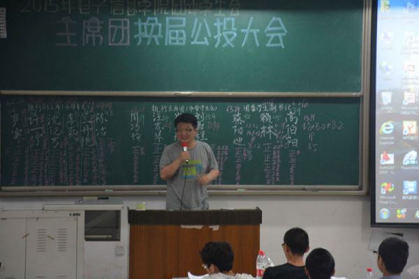 下午3:30,换届选举准时开始。首先,江安校区团委学生会副书记全婷婷同学宣布此次换届选举的细则。接着由11位参选的同学分别上台进行竞选演讲。每位竞选者将自身优势、不足以及对未来工作的展望都在自己的演讲中体现出来。演讲完毕后,团委全体干事及各班学生代表对参选同学进行投票。最终,赖林同学当选2015年团委学生会副书记,刘嘉程同学当选团委学生会执行主席,崔林旭同学当选执行副主席,许一宁同学当选执行副主席兼青志队长。竞选结束后,由团委书记李运国老师发表讲话,表达了对4位当选者的祝贺以及对未来MX动漫