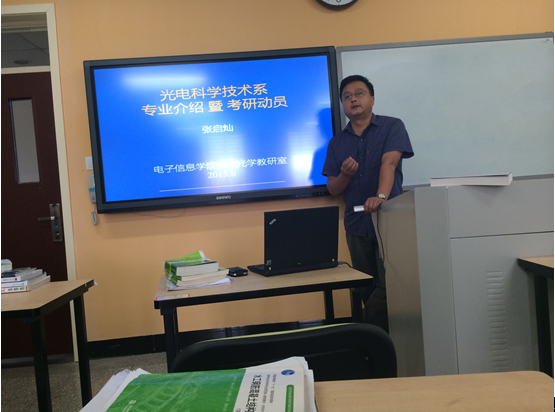 本次师生交流会旨在邀请老师给同学们就考研以及工作的困惑提供了一个交流平台。此次交流会的主题是——“光电科学技术系专业介绍暨考研动员”,首先,张启灿教授询问了同学们近来的学习生活,与同学们展开了亲切的交谈。随后,张启灿教授详细地讲解了自己制作的精美的PPT,其中包括:光电科学与技术的专业分类,光电科学与技术的专业前景和继续深研本专业的优势。最后,同学们积极踊跃提出自己的困惑,氛围相当活跃。主要问题包括以下几个内容。一是关于研究生面试过程中老师是否很注重学生的技术能力。老师表示在一般的面试过程中基本上是不涉及到技术的提问的,并补充说老师们注重的其实还是学生的综合能力。二是相关同学询问了关于光电类方面的就业问题,重点想了解有关于光电类就业状况和发展前景。张启灿教授表明,要想进入光电类相关的行业,分析、设计理论的学习和积累也是相当必要的,因为这些能够帮助大家更准确的把握企业的问题并提出很好的解决方案。而关于光电类方向的发展,张启灿教授表示光电类方面的就业,公司更注重的员工的经验,此项东西是靠学习无法获取的,但是现阶段,同学们可以注重系统整合能力的培养,而此项工作对系统和相关的硬件软件的熟悉程度有一定的要求。在此次交流会进行过程中,整个教室洋溢着其乐融融的氛围,张老师如同朋友般与同学们进行交流,让此次交流会在轻松愉悦的氛围中结束。