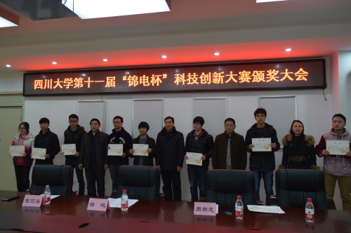 本次颁奖典礼由陈笃海副书记主持。典礼伊始,全体人员起立奏唱国歌。随后,锦江电子公司副总经理杨鸣先生宣读了本届大赛获奖名单,并与学院领导为获奖同学颁发了获奖证书。本次大赛共评选出一等奖8组、二等奖8组、三等奖17组以及优胜奖5组。一等奖获得者夏茂才同学代表获奖选手发表获奖感言,分享了自己参与本次比赛的收获。而后,杨鸣先生发言,对获奖的同学表示了祝贺,鼓励同学们继续积极参与科技创新活动,培养创新意识和动手能力。最后,周新志院长再次对获奖同学表示衷心祝贺,同时,感谢锦江电子公司对本届创新大赛的大力支持,并表示学院将会一如既往地支持同学们进行科技创新活动及竞赛,希望同学们踊跃参加。颁奖典礼在热烈的掌声中结束。