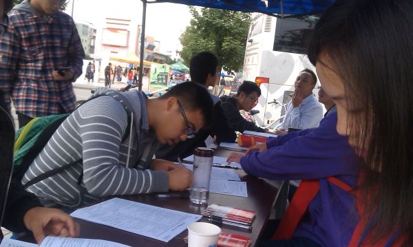 “腾飞”青志服务队的队员们在华联超市门口集合,人员到齐后进行了简单的分工。到了青春广场旁指定服务点后又进行了简单的培训,并换上志愿者服装迅速投入到了工作中。志愿者们分别进行着宣传、填表、服务的工作。工作的内容主要包括:对过往的同学进行无偿献血的宣传;指导有意愿献血的同学填表、体检;向献血者分发水、牛奶和礼品以及铺助护士们贴表、填献血证等。工作有条不紊地进行着。活动过程中,有同学询问无偿献血及盖章的有关事项,志愿者向他们进行了耐心地讲解。下午4:00分,在对下一批志愿者进行了培训指导后志愿者合影留念,工作顺利完成。