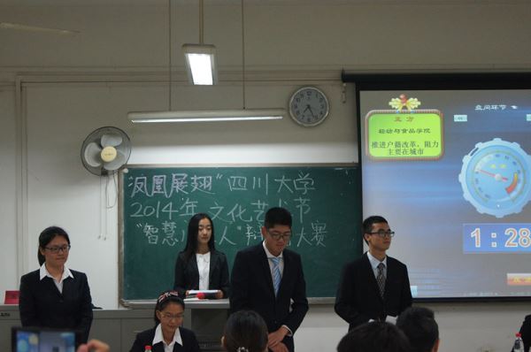 2014文化艺术节“智慧川大人”辩论大赛第一轮在一教A103展开。首轮辩论赛由轻纺与食品学院对阵MX动漫