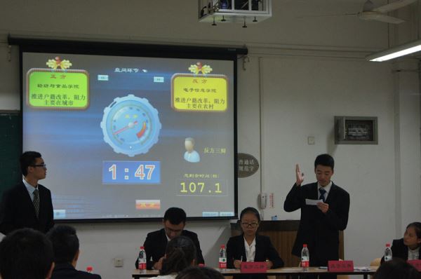 为反方,观点为推进户籍改革的阻力主要在农村。40分钟的时间双方互相盘问,出现了一次又一次犀利的提问和精彩的反驳。辩手们紧密的逻辑思维与迅速的反应能力给大家留下了深刻的印象。最终轻纺与食品学院技高一筹,赢得胜利。赛后,评委对辩论赛进行了点评,细致讲解了辩论中的逻辑关系。
