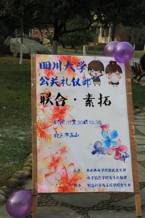 江安校区的不高山下,在主持人经过简单的分组以及讲述素拓活动游戏的规则之后,素拓活动正式开始。共32人,8人一组,被分为了4组。每组需从不高山下出发,途经工程训练中心,运动场一号场,图书馆等6个活动关卡点。在每个关卡点,每组队伍要依靠团队的力量完成“解人锁”,“抛接球”等团队型的小游戏方可在该关卡过关,过关获得签字确认方可前往下一关卡进行游戏。在长达一个半小时的游戏过程后,完成比赛的前三名获得活动举办方提供的小礼品。