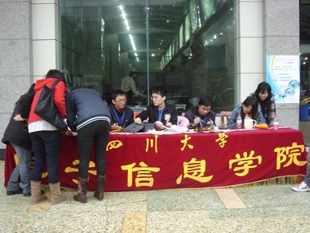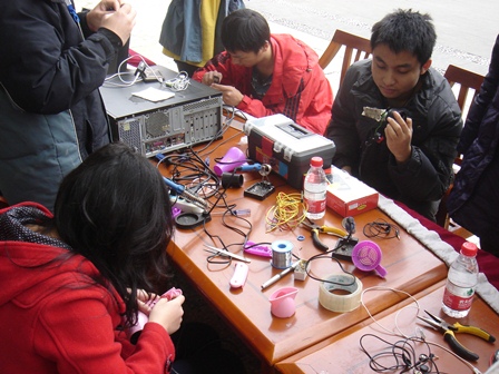 研究生分会和物理学院研究生分会举办的。为了“服务同学,完善自我“的宗旨,志愿者们免费为同学们维修电脑、Mp3、耳机、台灯、优盘、电风吹、手电筒等。早早地我们的志愿者们桌上各种维修工具万用表、电烙铁、焊锡丝、螺丝刀等就一应俱全。因此上午开始桌前就聚集了不少需要帮助的同学,到了中午桌上不再仅仅是维修工具,也同样摆满同学们的各种坏掉电器。再看看我们的维修人员吧,忙着卸螺丝、上焊锡、查电路,真是恨不得一只手能当两只来用。他们不仅仅在忙着手里的活,还不停地向同学们讲述维修知识。一位同学看着自己的机器上拆下的电路板,看得出神,仿佛要忍不住借一把烙铁自己去焊。