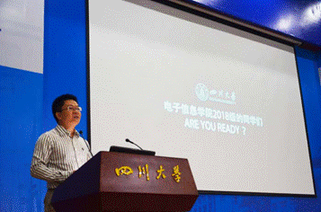 五粮春优秀青年教师获得者卿粼波副教授以“学长”的口吻亲切地为同学们展示了学院的发展现状与前景,并结合自身经历为同学的大学生活提出了很多建议;在校生代表2015级阳港同学为同学们分享了自己大学生活的体会和学习生活习惯,向同学们展现了他入学四年来凭借对专业的兴趣和坚强的毅力斩获各种优秀头衔及奖项的经验。最后,新生代表2018级学生詹沛文同学带领同学们回顾了有泪有汗的高考之路,他坚定大学是一个新的起点,明确了对自身的高标准和高要求,并表达了自己身为MX动漫