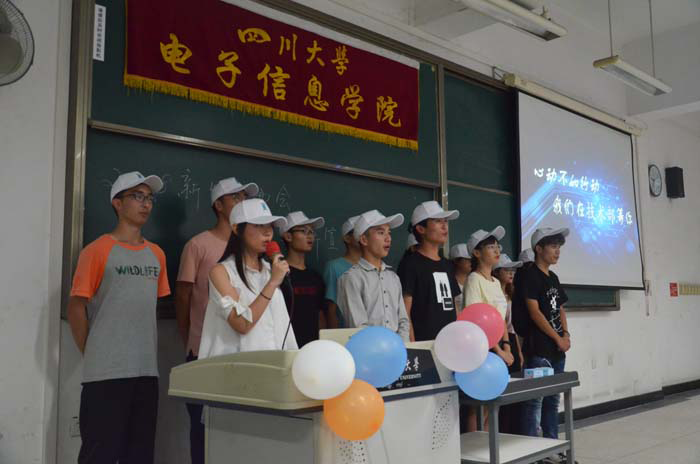 晚上7:00,宣讲会正式开始。电子科技园是在团委学生会之后宣讲的。但与学生会不同的是,科技园是以一段科技成品的展示来开场的。讲台前灯光暗淡,唯有科技成品的灯光在闪耀,或明或暗,色彩斑斓,画面十分壮观!前来参加宣讲会的同学们都被眼前的画面给深深吸引住了,这场表演无疑也提升了新生们对科技园的好奇。表演过后,科技园的主席团上台向同学们介绍科技园的特点,职能,以及一些举办过的优秀活动等等。这之后便是科技园各部门介绍自己部门的特点,呼吁大家加入科技园。最后,科技园全体成员上台一齐高喊:2018,我们在科技园等你!科技园以这种方式结束了此次的宣讲会。