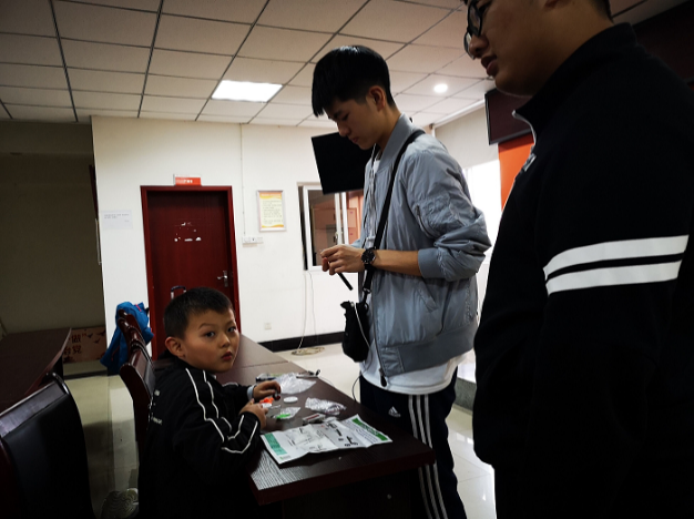 首先,志愿者们拿出准备好的电子小车,交给小朋友们动手组装。组装过程从清点零件开始,小朋友们都十分投入。(图一)组装过程中,小朋友们遇到不能完成的步骤,就积极询问志愿者。志愿者们都耐心地手把手交给小朋友们如何组装,边教边让小朋友自己动手尝试(图二)。在最后手工活动即将结束之时,一个小朋友的小车出了故障,她匆忙找到志愿者寻求帮助,志愿者在仔细检查了她的小车之后,找到了解决方法并且细心地将她的小车修好(图三)。看着小朋友满足的笑脸,志愿者们心中都感到无比的温暖。