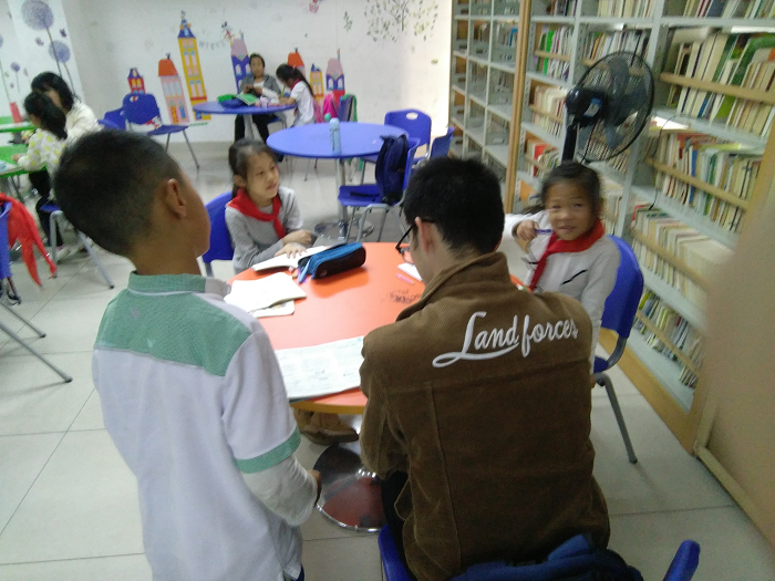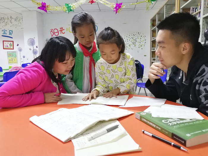 的青年志愿者在下午早早来到新街社区学生活动室,等待着即将到来的小朋友们。小朋友们进入活动室后与志愿者们热情问好,之后就乖乖地坐在座位上开始完成自己的家庭作业。小朋友们写作业时都聚精会神,遇到解决不了的问题时,他们就会向志愿者求助。每当小朋友们提问时志愿者们总会耐心地为他们解答。图一为志愿者向三位小朋友解释数学问题的算法,图二为小朋友正在努力思考,志愿者正在检查小朋友作业中的错误。在志愿者们的帮助下,小朋友们发现并改正了自己作业中存在的错误,并掌握了有效的学习方法。