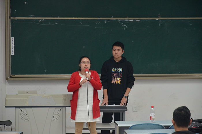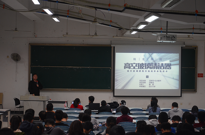 16:50,宣讲会正式开始。首先,姜越同学上台分享了其小组的参赛作品“高空玻璃清洁器”,介绍了作品的研发过程以及其小组的参赛经历。姜越同学的精彩讲解让同学们对“互联网+”大学生创新创业大赛有了初步认识,同时姜越同学讲述的参赛时所遇到的困难引起了同学们的深思。紧接着,吴云皓同学上台为我们分享“互联网+”大学生创新创业大赛的比赛经验。吴云皓同学为我们详细地介绍了“互联网+”大学生创新创业大赛并强调了大赛的性质以及其侧重方向——商业性。吴云皓同学还分享了她所在小组参赛作品以及赛场答辩经验。两位同学绘声绘色的介绍引来了同学们的阵阵掌声。在提问环节,两位同学对即将参赛的同学们所提出的问题作出了简明扼要的回答,为同学们解答了他们的有关比赛的一些疑惑。18:00,本次“互联网+”大学生创新创业大赛宣讲会圆满结束!