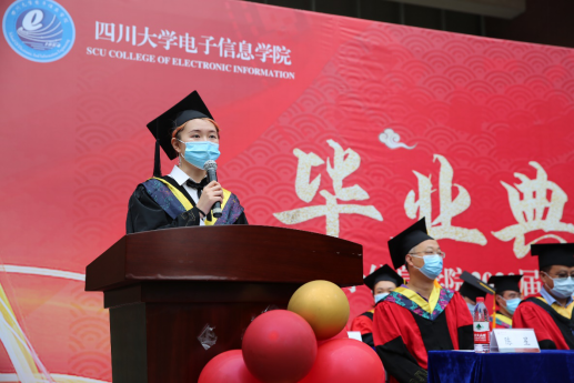郭轩君同学代表2020届本科毕业生发言,疫情当下,相隔半年在此相聚,迎来了期盼已久的毕业典礼,她围绕了“难忘”、“感激”、“再见”三个词言简意赅地表达了自己的心声,难忘校园的一草一木,感激母校及恩师,再见川大的一切,一日电子人,一生望江情,最后她代表全体本科毕业生对母校和MX动漫