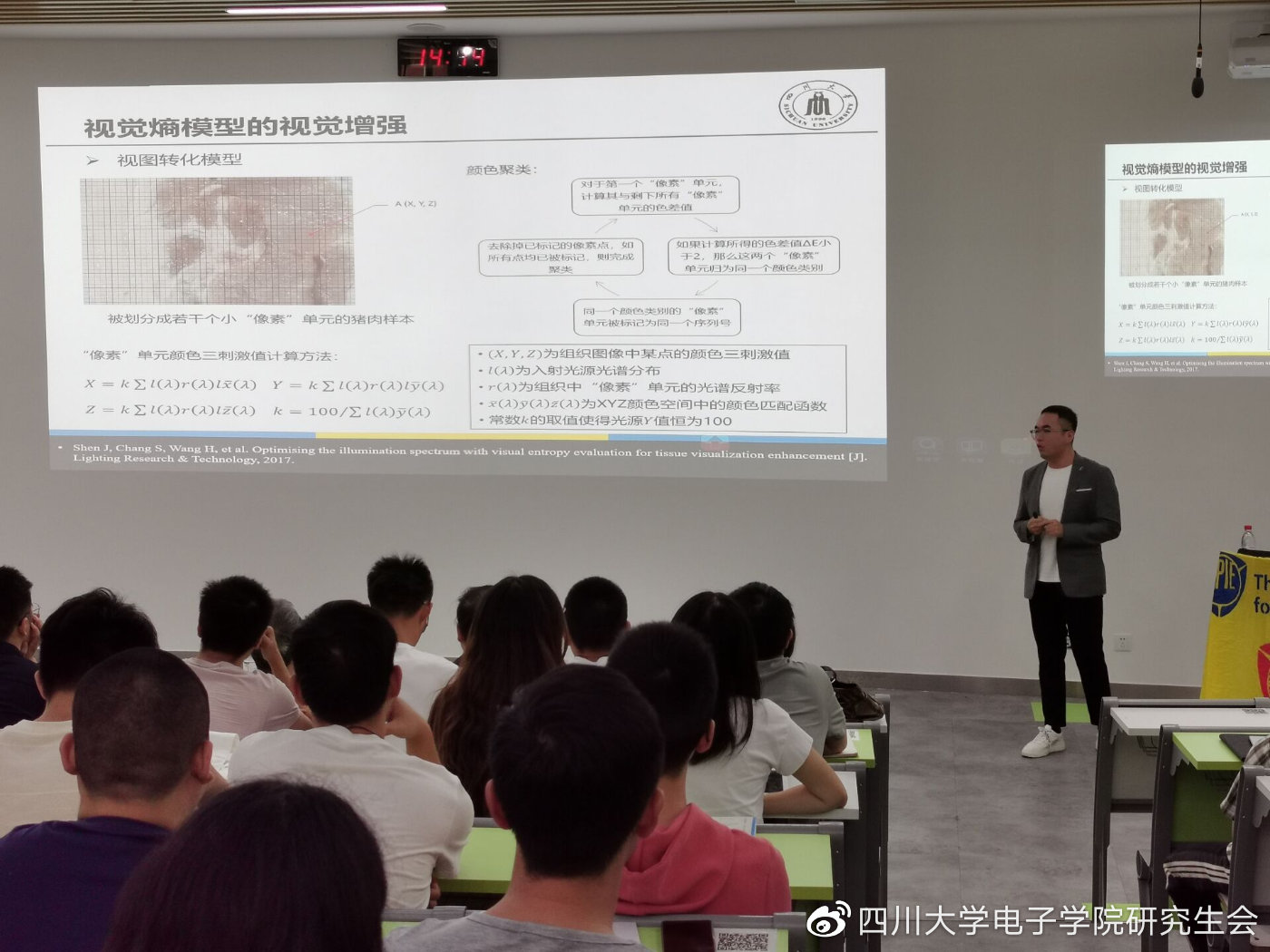 计算机生物光学成像在医疗视觉增强系统的实现,并利用建模进行分析。整个教室座无虚席,同学们也认真聆听、对演讲内容耐心做笔记并积极参与互动,也带动了申博士的演讲激情。