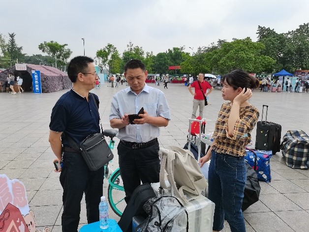 党委陈笃海副书记来到了学院迎新点处。现场他与辅导员老师共同商量迎新事宜,与志愿者同学们交流以了解工作开展情况,并询问关注新生还需哪些帮助。