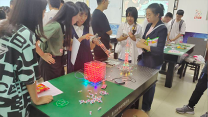 上午10时,电子科技园游园活动拉开了帷幕。在外联部部长的带领下,同学们首先来到了A117教室,行政部的部长们对同学们的到来表示热烈欢迎,在进行了简短的游戏后,同学们来到A116教室参观技术部部长们的作品。展示的作品有很多,其中较为基础的便是基于51单片机制作的心形流水灯、指纹锁、流水灯塔等。展品中也有一些制作难度较高的作品比如机械臂、遥控小车,超声波雷达等。部长们对这些作品的工作原理进行了详细的解释并让同学们亲自动手实践,让同学们感受到了知识与实践相结合的魅力。