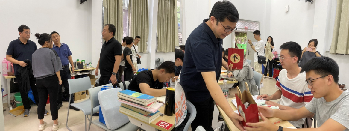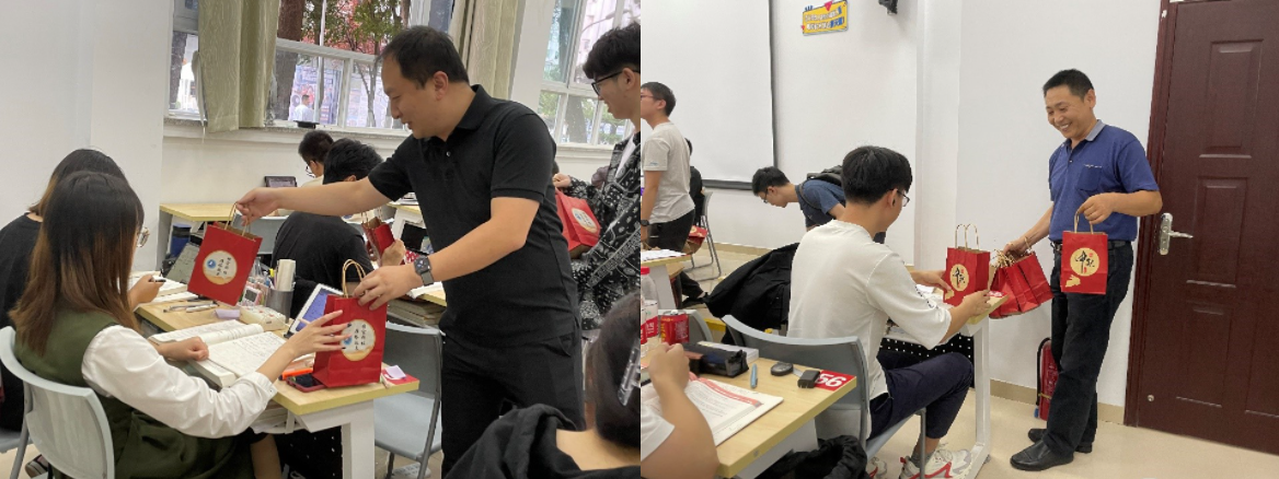 活动开始,三位院领导亲自给在考研自习室的同学分发了月饼、牛奶、纪念钥匙扣等具有学校学院特色的定制中秋大礼包。同时与同学们亲切交谈,关心他们的学习进度,并送上了诚挚的祝福。同学们脸上都洋溢着幸福的笑容。