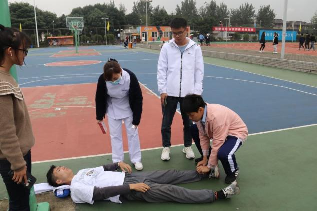 运动会进行期间,场外的同学积极服务和帮助参赛选手,为选手提供食物和水,并确认选手的身体状况是否良好。迎面接力中有同学大腿拉伤,服务的同学们积极主动地关心帮助受伤的同学,并及时联系医务人员,使受伤同学得到了有效的救护。
