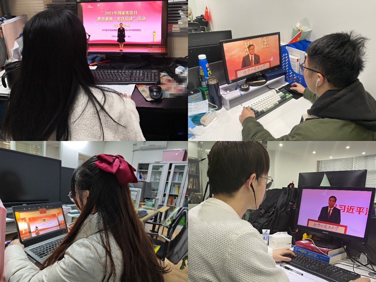 与此同时,学院其他学生大多数在寝室、实验室、研讨室等地方采用自行学习宪法的方式,同步观看“宪法晨读”直播活动。