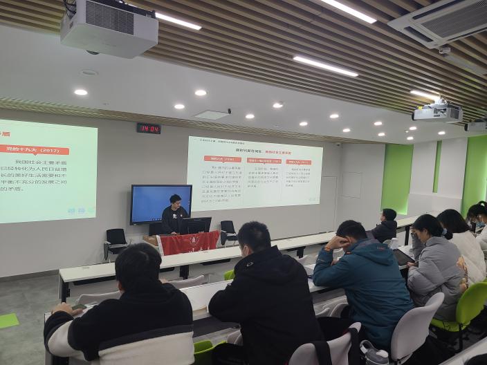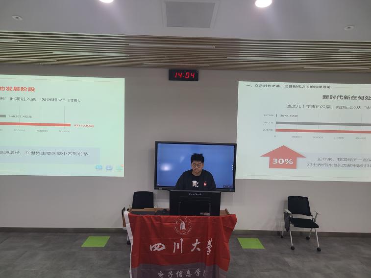 望江校区基础教学楼C座104教室面向本科2019级同学开展。本次宣讲由2019级本科党支部宣讲员邹浩宇带来题为“习近平新时代中国特色社会主义思想是党和国家必须长期坚持的指导思想”的分享。学院李运国老师、吴秀玲老师以及2019级本科光信息科学与技术专业、通信工程专业同学参加本次宣讲会。