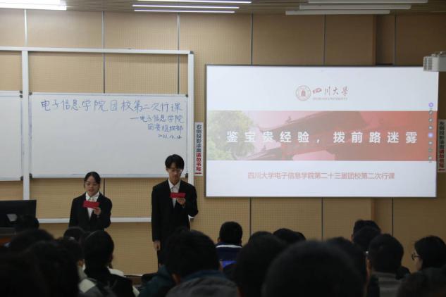 本次行课于10点15分准时开始,由李云天、陈洁同学担任主持人。首先是全体同学奏唱中国共产主义青年团团歌。随后,2018级黄奕翔同学进行了竞赛、保研、出国的经验分享。黄奕翔系18级团委学生会副主席兼“腾飞”青年志愿服务队队长,现已保研至东南大学毫米波国家重点实验室。他就自己的学习、竞赛和保研经历对同学们进行了具体的经验分享。黄奕翔语言幽默风趣,生动形象,在场的同学对竞赛和保研都有了进一步的了解。
