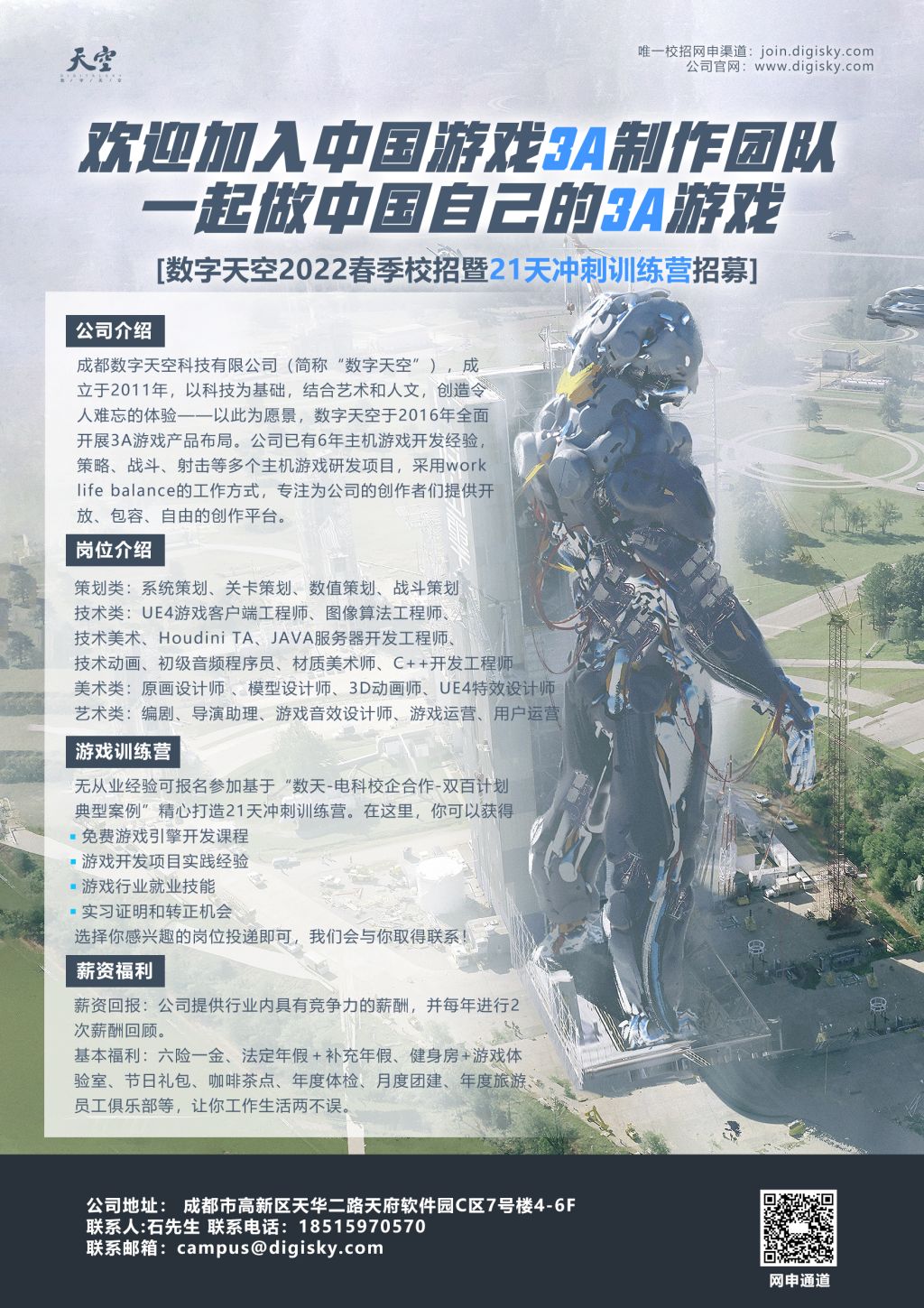 做中国自己的优质3A游戏,成都数字天空2022春季校园招聘来了!
