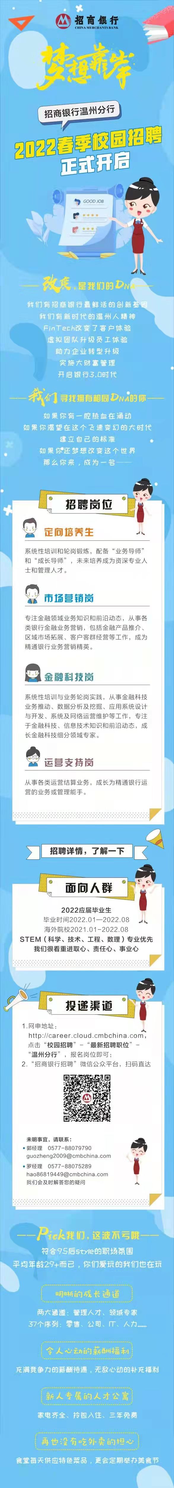 招商银行是全球500强企业上市公司,市值破万亿。温州分行校招优政:三年员工宿舍(拎包入住公寓);所有岗位年薪10万起;3个月入职培训(含招银大学)+上岗双导师辅导;文体活动丰富,各类俱乐部; 每月读书心得100元,跑步100元,总行中稿1000元......。 欢迎看图扫码网申,线上面试已启动