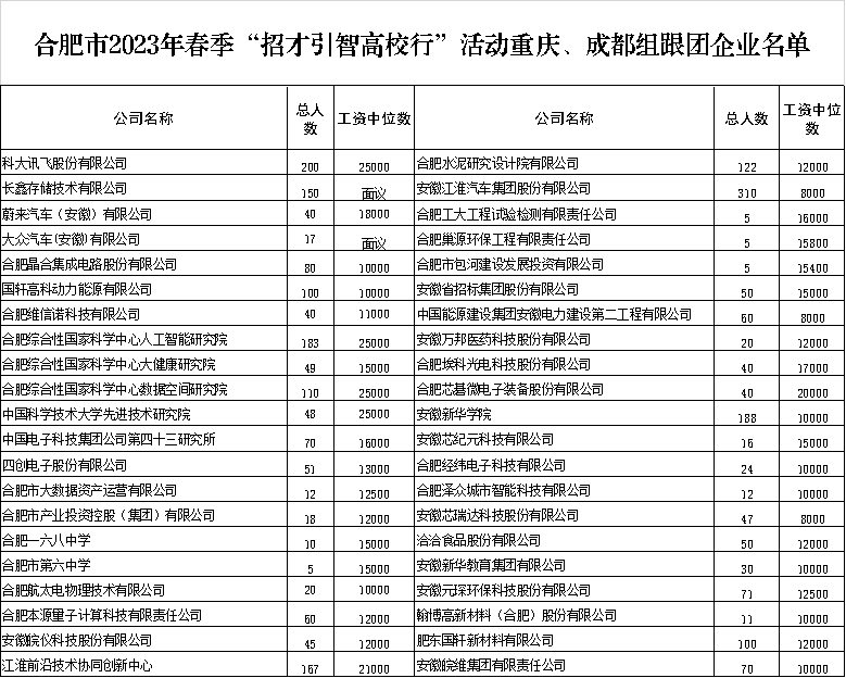 为全面贯彻党的二十大精神,深入实施“人才强市”战略,大力开展“人才招引和服务保障大提升”行动,3月,合肥市组织重点企事业单位赴北京、上海等15个城市41所高校开展2023年春季“招才引智高校行”活动。活动期间,将举办现场招聘会,推介人才发展环境,诚邀优秀高校毕业生来肥就业创业,为全面推进中国式现代化合肥实践提供智力支撑。