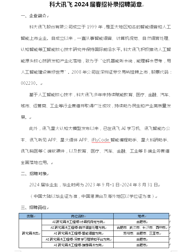 科大讯飞2024届春招补录招聘简章