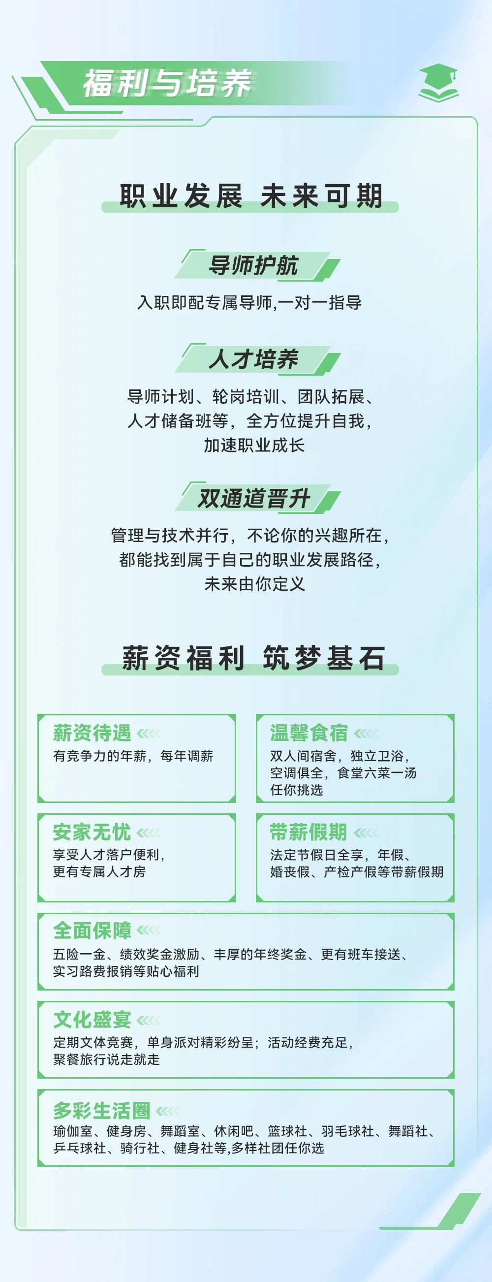 【福利】:有竞争力的薪酬,每年调薪;交通、食宿等各种补贴;五险一金;各种社团活动