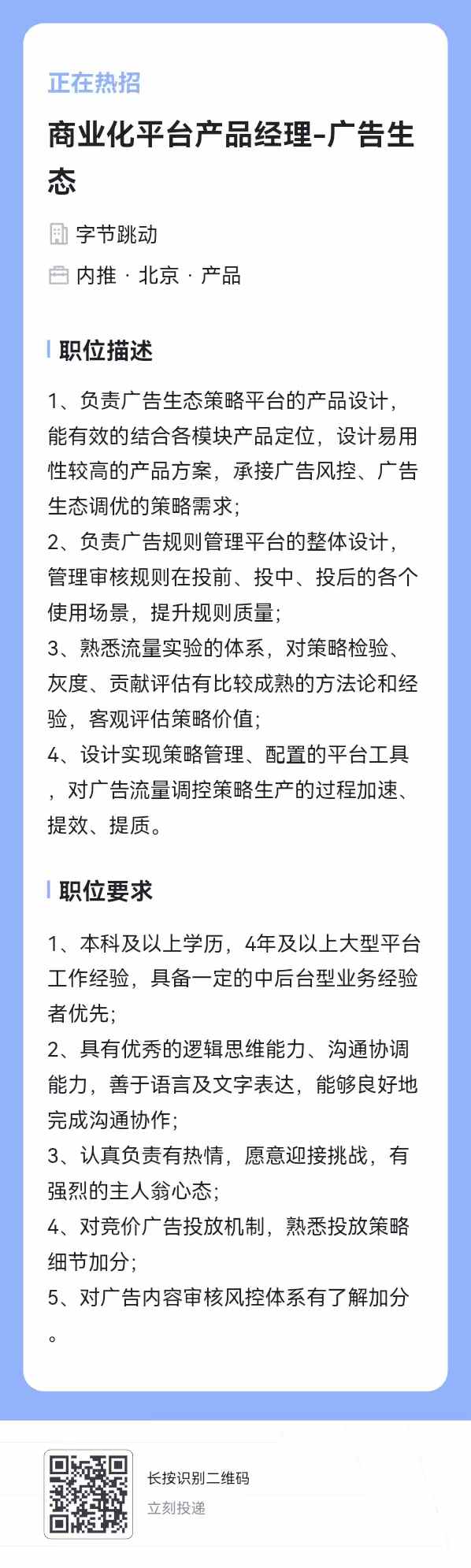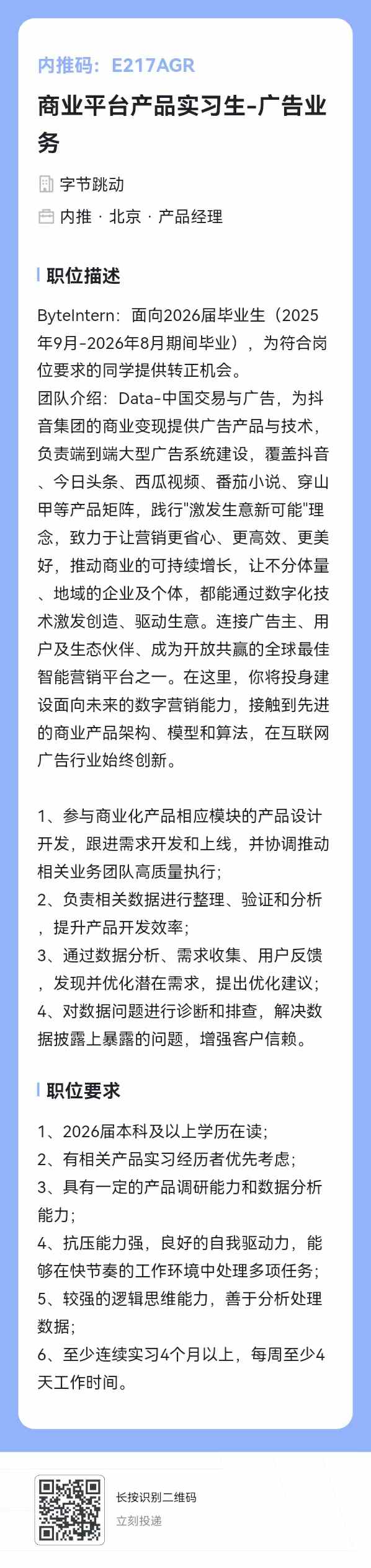 在字节的MX动漫 2018级硕士王校友(微信wy731505024)发消息,招26年毕业的校招生、实习生(可转正),以及社招商业平台产品经理,有看机会的同学或朋友欢迎推荐