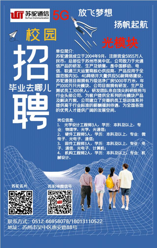 苏州苏驼通信科技有限公司是一家专注于光模块研发的通信公司,位于苏州市吴中区。9月28日上午九点,苏驼通信将在北园宿舍乒乓球台处举行招聘会。