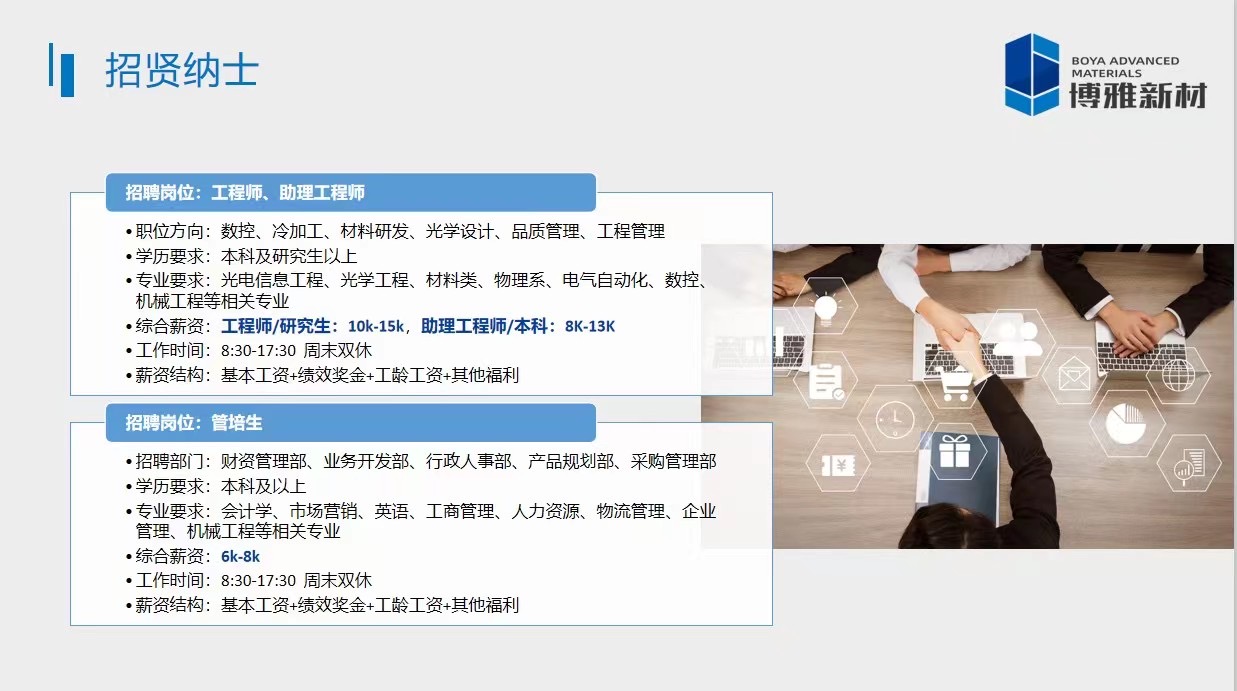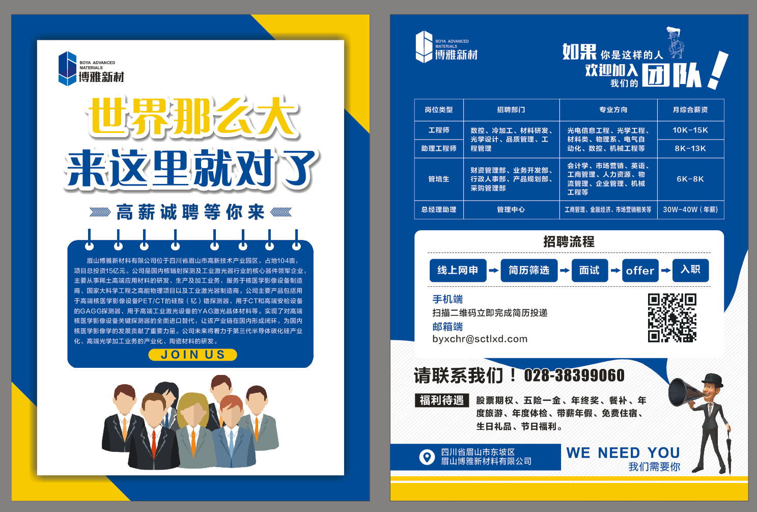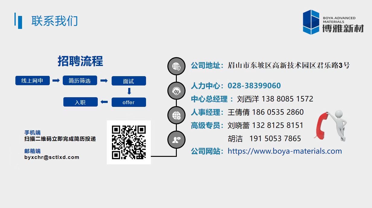眉山博雅新材料有限公司是一家致力于光电材料研发,生产,销售及技术服务为一体的民营高科技公司,4月21日下午16:55到18:00在望江校区第三教学楼 149进行校园宣讲会,欢迎各位同学前来参加。