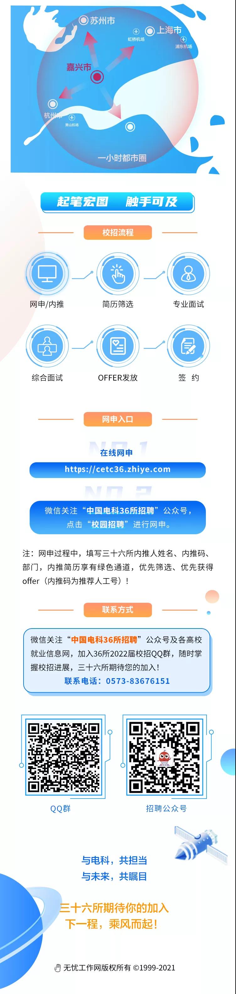 中国电科三十六所2022届校招宣讲会:【MX动漫 】9月26日15:20-17:20,就业指导中心221室★事业编制、安家费(硕士15-28万、博士35-68万)等福利,具体请登入各高校就业信息网查看,三十六所期待您的加盟!★请携带个人简历及相关材料参加现场宣讲,并完成网申,欢迎邀请其他同学参加现场宣讲会。