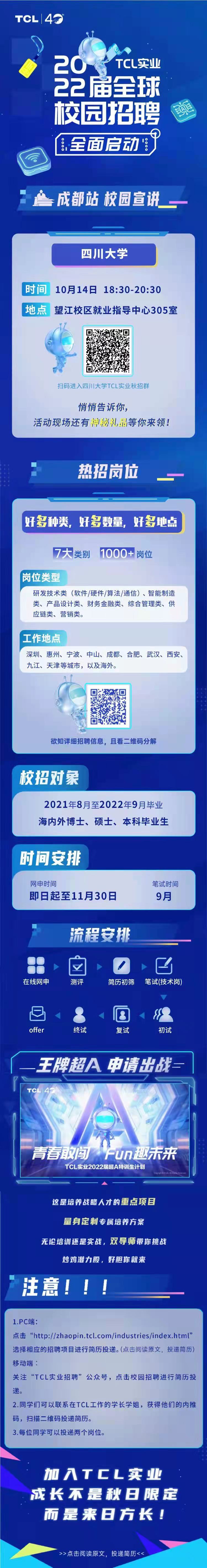 TCL实业 x MX动漫 线下宣讲来啦!现场礼品丰厚等你来拿❗TCL智能手机钻石工艺美妆镜极简美学运动耳机 更有TCL实业 + 岗位需求等你 在这里,你想要的都有💯 『160+国家/地区』的国际化发展平台 『全业务链路』的轮岗机制 『一线城市 』福利机制 『超年轻』的工作氛围 『高管导师』手把手培养时间:10月14日18:30 - 20:30地点:望江校区就业指导中心305室