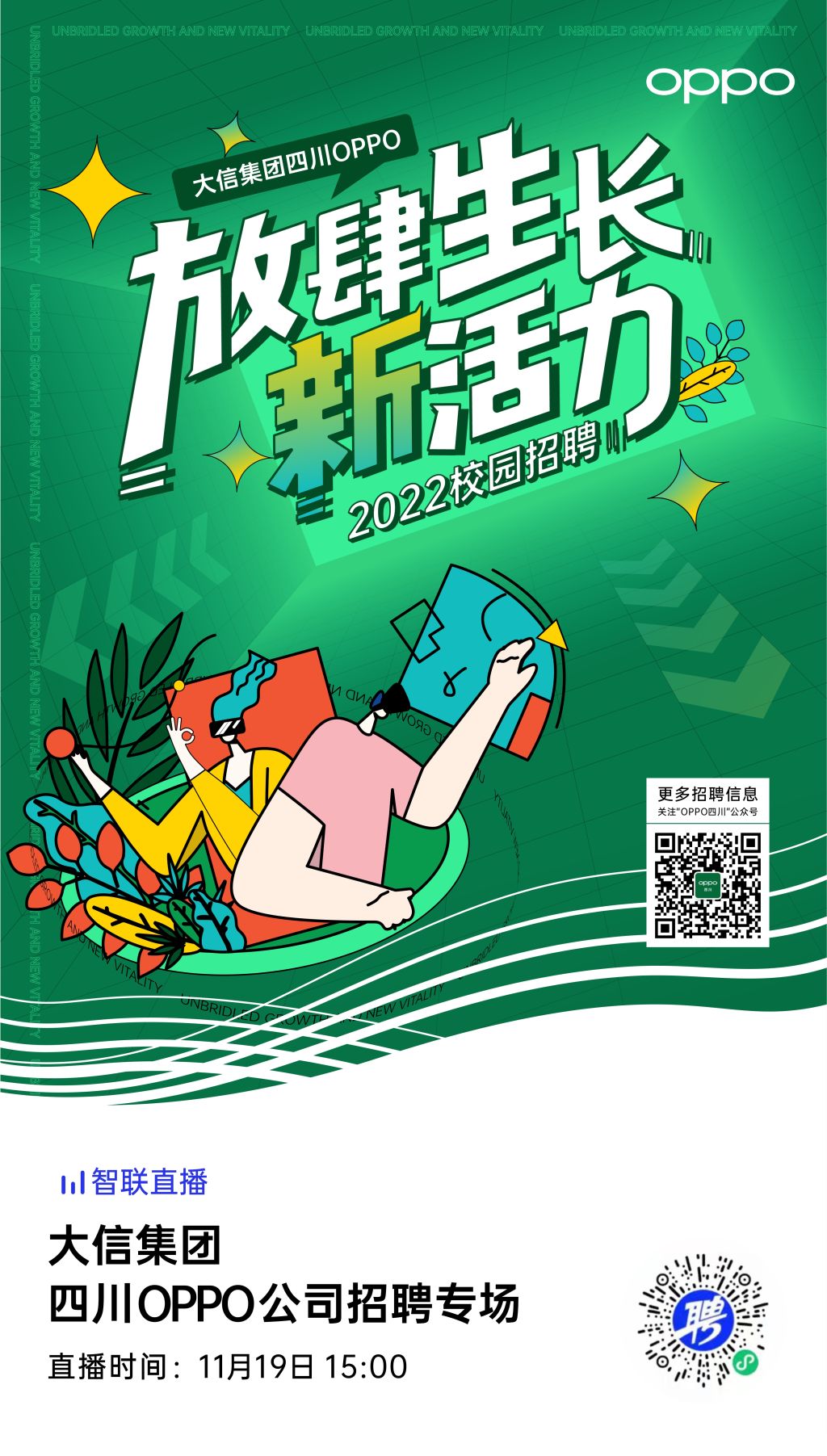 【大信集团·四川OPPO专场招聘】 线上宣讲会 时间 :11月19日15:00-16:30 直播平台 : 智联招聘(扫描下发二维码进一键直达)或者点击链接://z2u.tv/0Z8Wo7 福利抽奖 : 宣讲会现场设置抽奖环节 ,OPPO Watch2手表、运动手 环、蓝牙耳机等你来拿~~