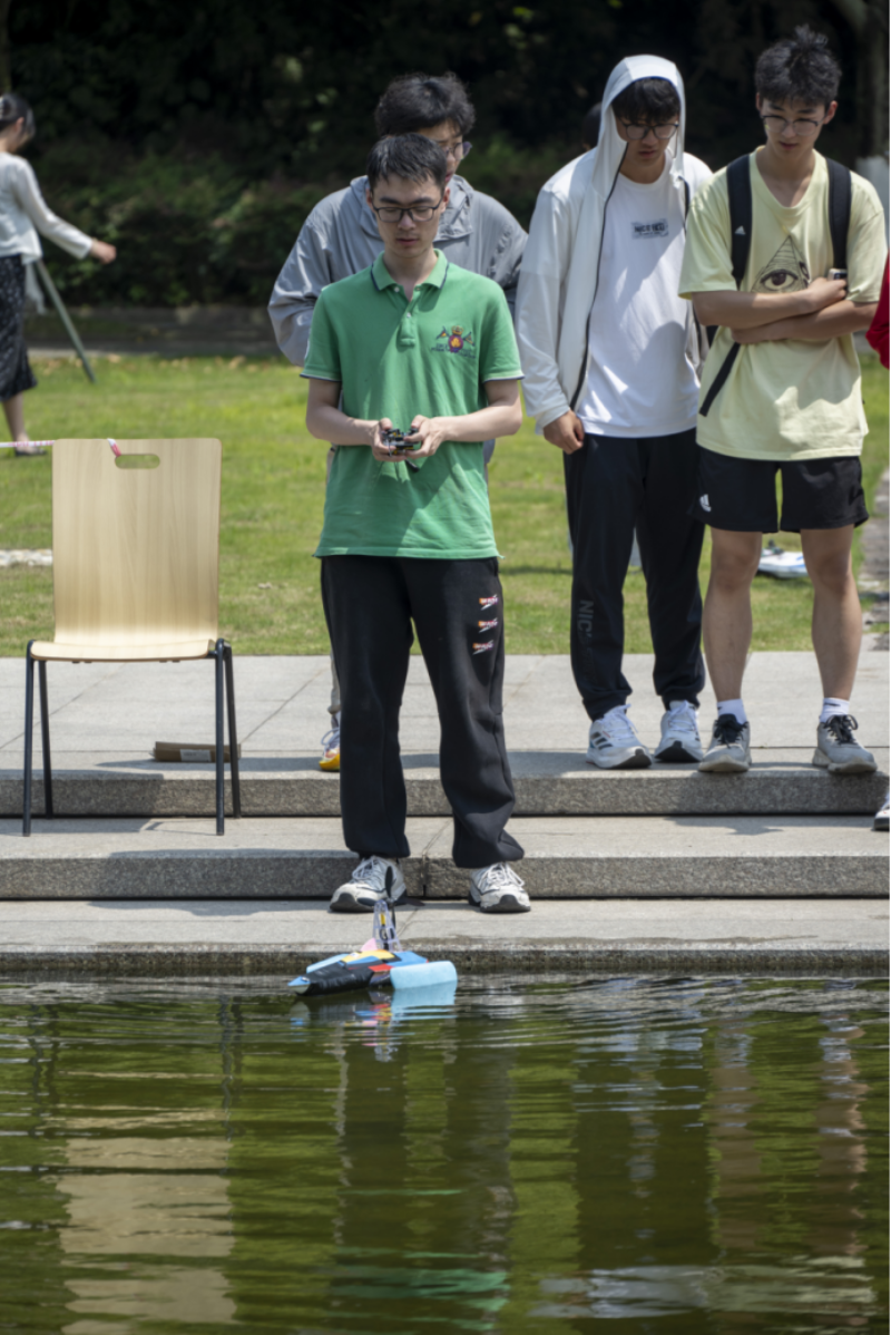 下午13:00,水上竞速环节正式开始。在紧张而又热烈的氛围下,选手们一个接一个进行他们的最后一战。随着哨声的响起,选手们的船只向前猛冲,绕过一个又一个的浮标,冲向终点。每一组的精彩表现都赢得了其他选手和在场观众的掌声和欢呼。选手们在赛场中碰撞智慧,比拼才能,共同成就了一届精彩圆满的青春盛会。随着最后一支队伍冲线的哨声响起,本次船模大赛决赛圆满结束。