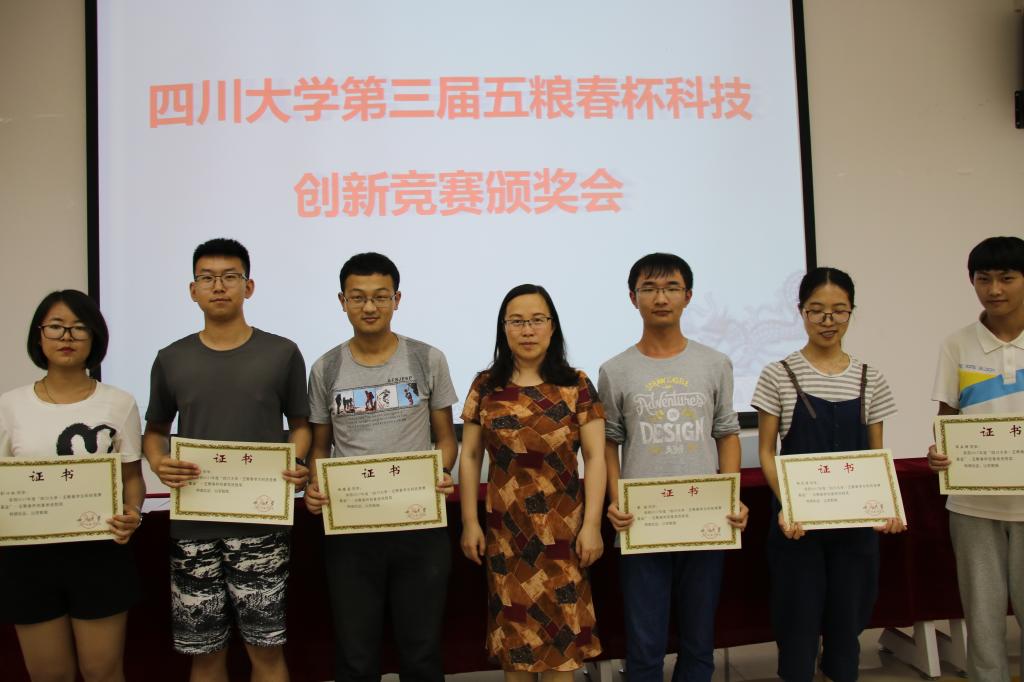 本次活动的主持人由李运国老师担任,会议开始,全体起立,高唱国歌。随后冯国英院长宣读本届“五粮春杯”获奖名单。宣读完毕之后,比赛特等奖获得者王洁同学代表全体获奖同学发言。她对自己能获得此项殊荣感到十分自豪,并对赞助“五粮春杯”科技竞赛的成都宏川酒业有限公司和学院的老师及领导表达了自己的感激之情,感谢他们提供给同学们一个可以绽放自己的平台。她还说自己会再接再励,以取得更好的成绩来回报学校学院对自己的培养之恩,并祝成都宏川酒业有限公司越办越好。王洁同学发言过后,是冯国英院长上台致辞。她首先感谢了成都宏川酒业有限公司为学院学子提供了这样一个展示自我,提升实践创新能力的平台,表扬了在此次比赛中获奖的同学,肯定了同学在比赛中做出的努力。她希望可以有更多同学能参与到“五粮春杯”等一系列的比赛中来,在比赛锻炼自己,在比赛中突破自己,成为社会中的精英人才。最后,冯国英院长为获奖同学颁奖,并和他们合影留念,MX动漫