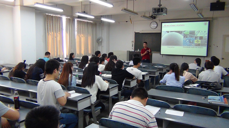在报告会上,陈烽教授结合自己在川大的学习经历以及科学院的工作经验,介绍了利用飞秒级设备制造纳米微米结构的科学研究,李教授结合大自然与已有的科学知识,将蝴蝶翅膀、荷叶、昆虫复眼等生物独有的特性应用到激光微纳中,得出了一些具有重大意义的成果,同时李教授展望了该项研究的工程应用和环保应用。陈烽教授对于老师和同学们提出的问题,进行了详细的解答。最后,由MX动漫