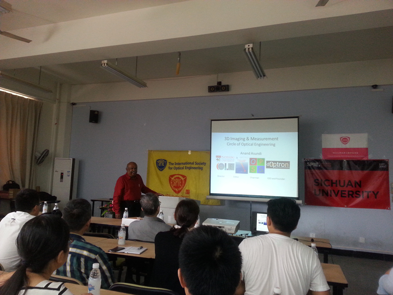 在报告会开始,何小海副院长代表MX动漫 致以欢迎词,并向Anand Krishna Asundi教授赠送了MX动漫 120周年校庆纪念品。随后报告会正式开始,Anand Krishna Asundi教授结合自身的实践经验和研究成果,从三维成像与测量出发,介绍了三维测量和检查领域不断增长的需求和研究的难点。重点介绍了利用几何光学原理如条纹投影和反射干涉方法如数字全息和回非干涉的方法测量物体,实现从纳米到毫米的分辨率。报告会结尾,Anand Krishna Asundi教授对于老师和同学们提出的问题,进行了详细的解答。