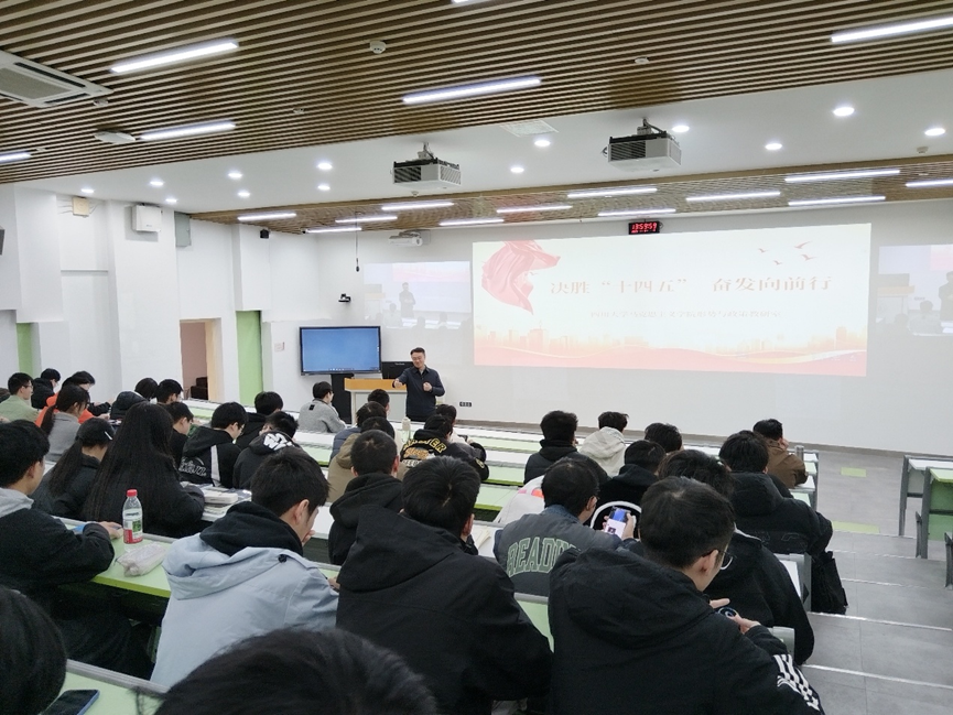 院长杨阳教授在望江校区基础教学楼C201为2023级本科生讲授了“决胜‘十四五’ 奋发向前行”主题思政课。